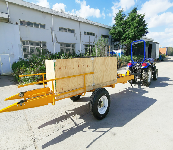 整機(jī)采用液壓馬達(dá)驅(qū)動(dòng)的鏈條絞鏈傳送裝置傳送果筐,采用液壓底盤升降的機(jī)構(gòu)可將車輛底盤調(diào)整到離地最小的距離,方便上下果筐。與拖拉機(jī)配合使用,可以安裝在拖拉機(jī)前方(帶有前懸掛的拖拉機(jī))也可安裝在拖拉機(jī)后側(cè)懸掛處;也可與其它帶有液壓動(dòng)力源的牽引車輛配套使用。